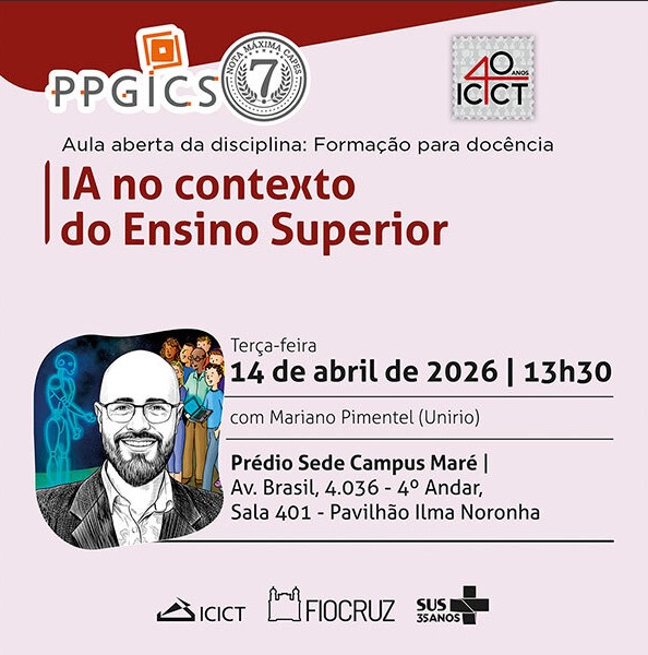 O Prof. Mariano Pimentel (PPGI-UNIRIO) será recebido pelas professoras Ana Luiza Pavão e Marianna Zattar, do PPGICS, na terça-feira, 14 de abril, a partir das 13h30, na disciplina “Formação para a Docência” em uma aula aberta sobre o “Uso de inteligência artificial no contexto do Ensino Superior”. Mais informações em notícias do PPGICS-FIOCRUZ.