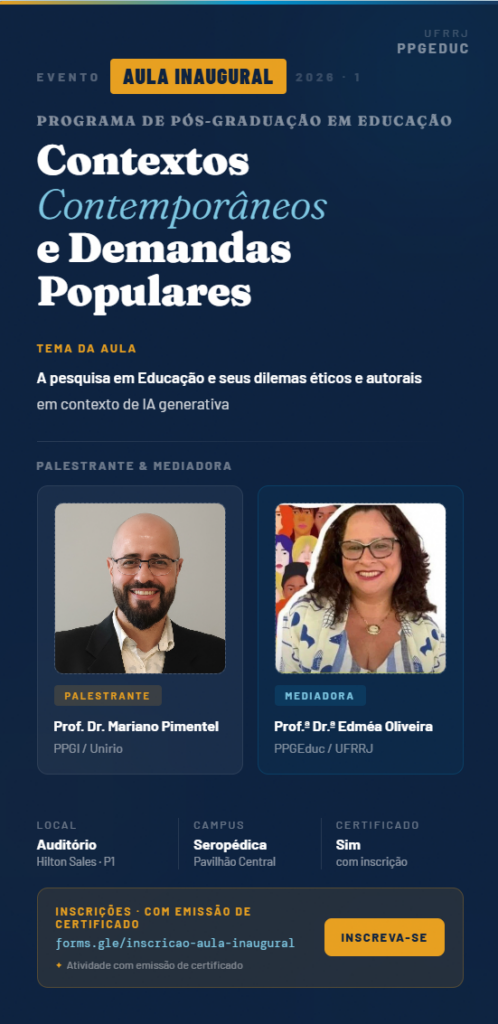 O Prof. Mariano Pimentel (PPGI-UNIRIO) ministrará a palestra “A pesquisa em Educação e seus dilemas éticos e autorais em contexto de IA generativa”, na Aula Inaugural do semestre 2026.1 do Programa de Pós-Graduação em Educação da Universidade Federal Rural do Rio de Janeiro (PPGEduc/UFRRJ).